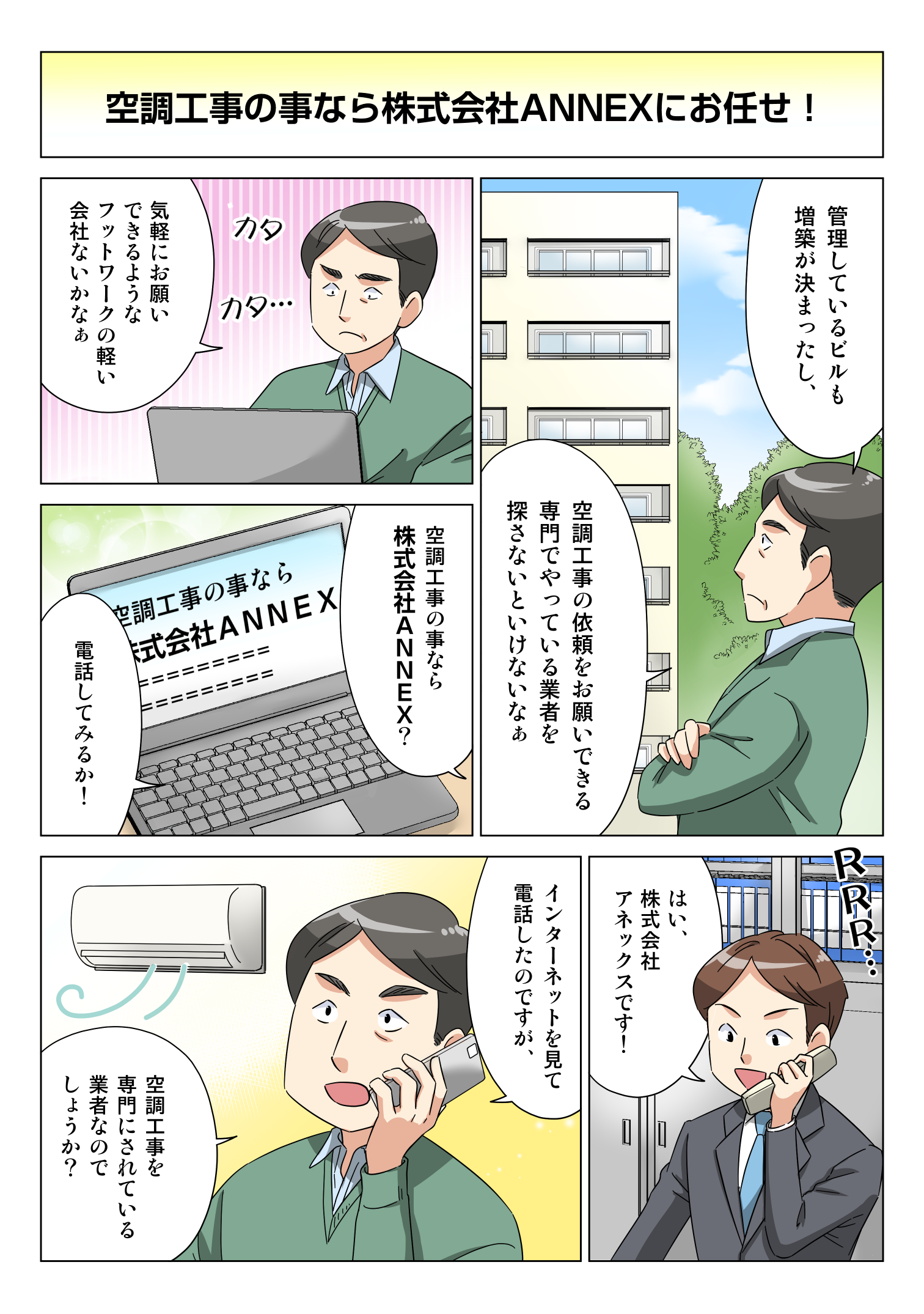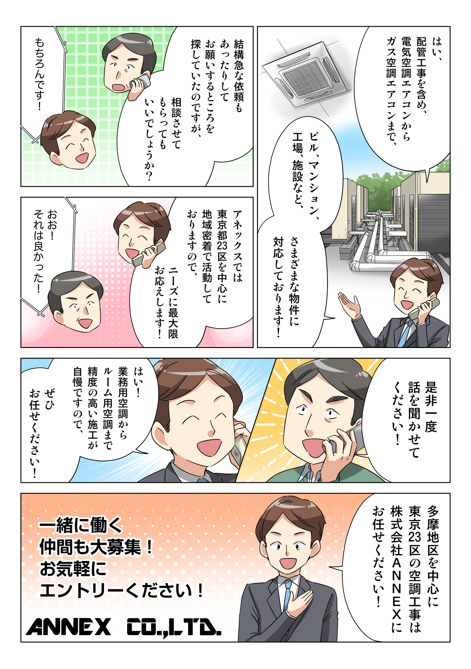多摩地区を中心に東京23区で空調工事を手がけている株式会社ANNEXについて強みや特徴をご紹介します。弊社は丁寧で高品質な施工を意識しながら地域に密着して事業に取り組んでいる空調工事業者です。エアコンのトラブルなどは緊急性が高い案件でしょう。できるだけお客様が困ることのないよう、フットワークを軽くしつつ、